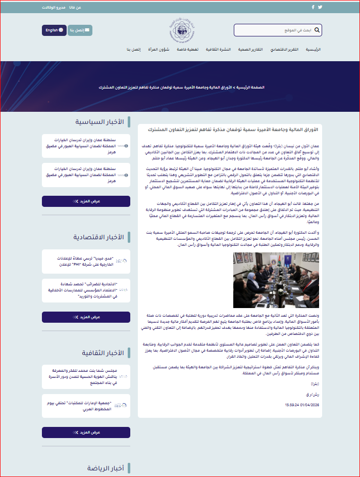 "الأوراق المالية" وجامعة الأميرة سمية توقعان مذكرة تفاهم لتعزيز التعاون المشترك فنا نيوز- 1-4-2026